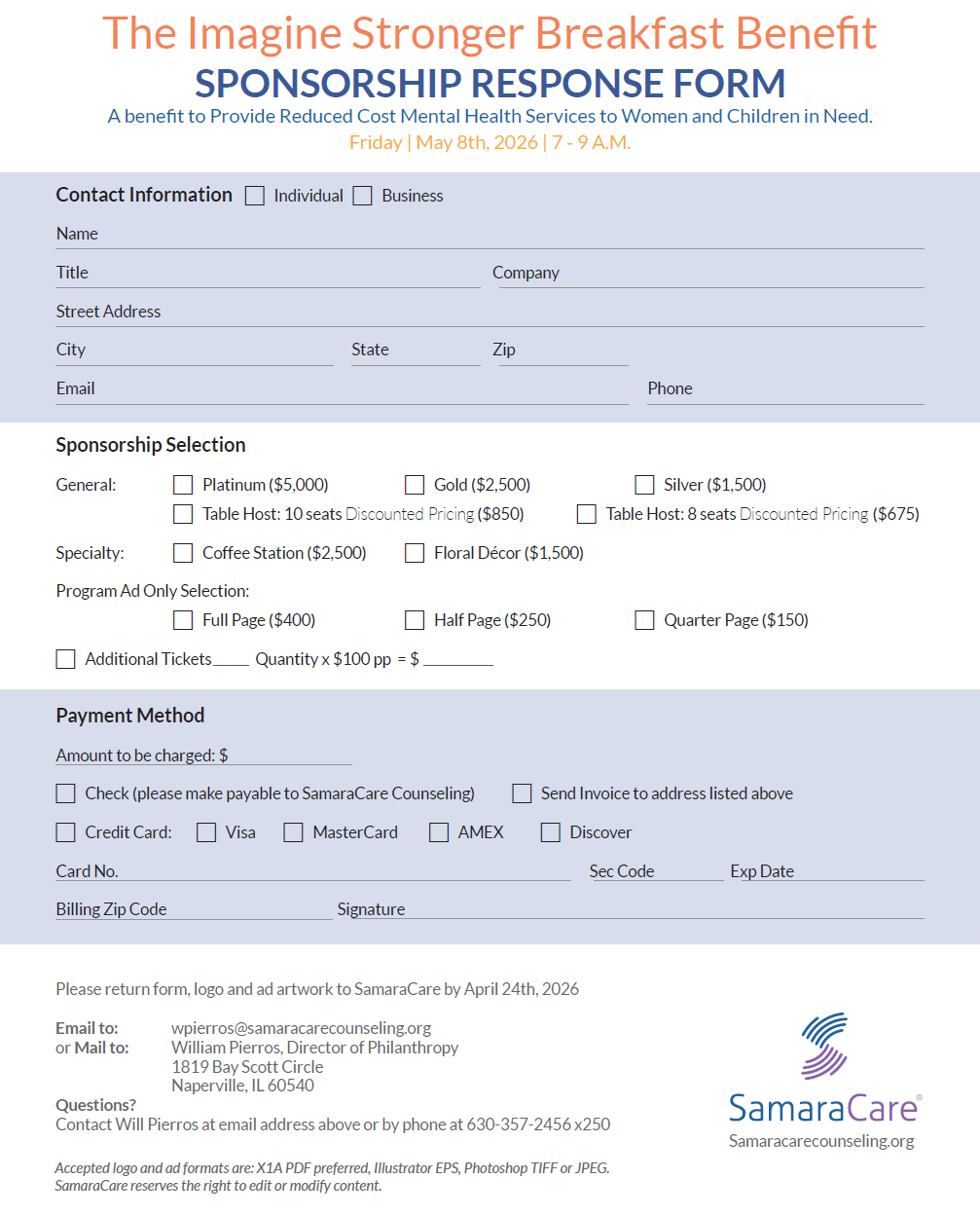 Become A Sponsor Support an upcoming event at SamaraCare by becoming a Sponsor Paper Form Submission For this event, we ask that you download and submit your sponsorship form via mail via the instructions noted at the bottom of the form. Thank you! The Imagine Stronger Breakfast Benefit A benefit to Provide Reduced Cost Mental Health Services to Women and Children in Need. View Event Details